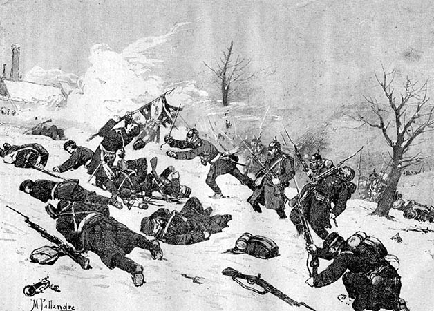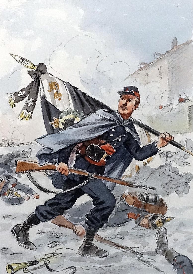 In der Histoire Populaire von L. Rousset findet sich auf den Seiten 1738 bis 1740 eine Beschreibung des Kampfes aus französischer Sicht. Verteidiger waren Truppen des Korps von Garibaldi und es war der Soldat Curtal, ein Jäger des Mont-Blanc, der erkannt hatte, dass beim Rückzug der letzten Überlebenden vom Infanterie-Regiment Nr. 61 die Fahne "vergessen" wurde.
