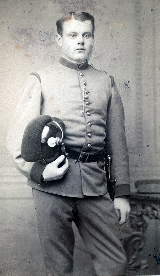 Vielleicht war ja auch der hier präsentierte Einjährig-Freiwillige mit Namen Oehrlein (Foto aus der Sammlung M. Stein), der in der 5. Kompanie des Infanterie-Regiments Nr. 9 diente, an der Anfertigung des Berichts für seine Kompanie beteiligt. Er trägt den polierten Helm der bayerischen Infanterie vom Modell 1868, erkennbar an den Lederriemen und der deutliche erkennbaren Trennung von Messingkrone vom Monogramm. Die Abzeichenfarbe des Infannterie-Regiments Nr. 9 war karmesinrot, die an Kragen und Ärmelaufschlägen zu erkennen war, dazu noch Messingknöpfe. Das Kennzeichen des Einjährig-Freiwilligen war auch in der bayerischen Armee eine in alternierenden Farben gestaltete Wollschnur, für die bayerische Armee weiß-blau.