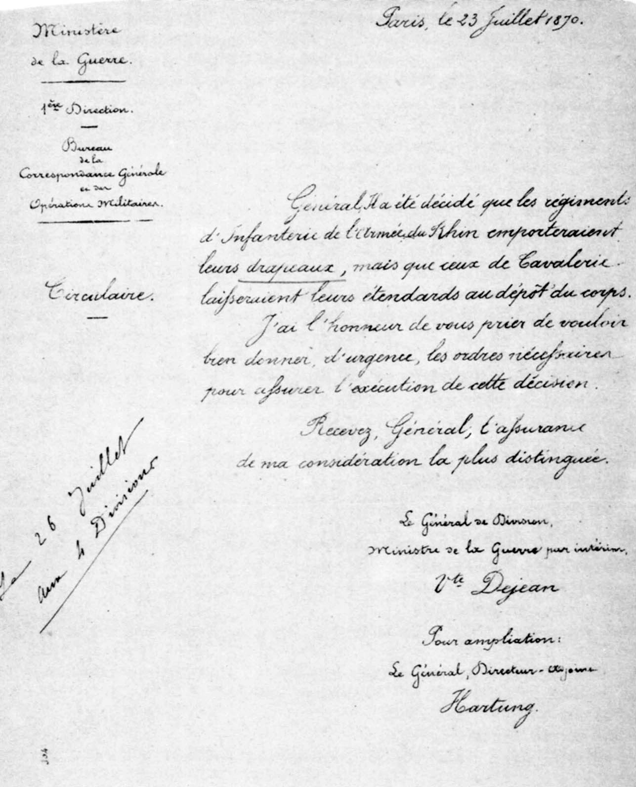 "Général, il a été décidé que les régiments d'infanterie de l'armée du Rhin emporteraient leurs drapeaux, mais que ceux de Cavalerie laisseraient leurs étendards aux dépôt du corps."