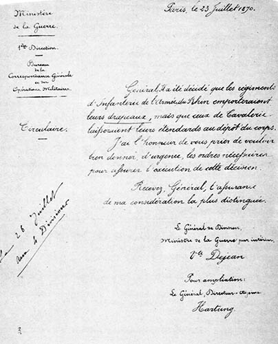 Im erwähnten Werk von Pierre Charrié ist ein Rundschreiben des französischen Kriegsministeriums vom 23. Juli 1870 abgebildet, das hier als Grafik beigefügt ist und den Befehl äußert: