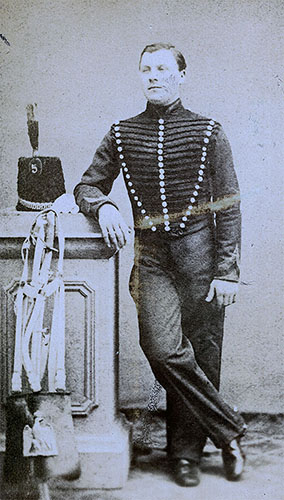 Der hier noch präsentierte Chasseur 1re Classe des 5. Regiments Jäger zu Pferd (Sammlung Markus Stein) ließ sich noch vor dem Krieg von 1870/71 mit seiner Kopfbedeckung, dem mit schwarzem Schaffell überzogenen Talpack und Koppel mit Säbeltasche und dem Säbel der leichten Kavallerie M1822 fotografieren. Ob er die Vernichtung der Standarte seines Regiments in Metz mit erlebte, ist nicht zu ermitteln. Jedoch könnte er im Falle einer Teilnahme am Krieg gegen die deutschen Truppen das Los vieler Kameraden, nämlich den Gang in die Gefangenschaft nach Deutschland, erlitten haben. Im zweiten Band des Werkes über die Uniformen und Ausrüstung der Armeen von 1870/71 sind auf den Seiten 232 bis 237 einige Originalstücke wie ein Talpack oder der dunkelgrüne Dolman abgebildet. Ein schönes Exemplar des Säbels M1822 findet sich bei den Husaren auf Seite 243.