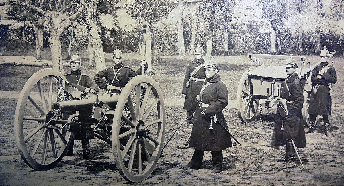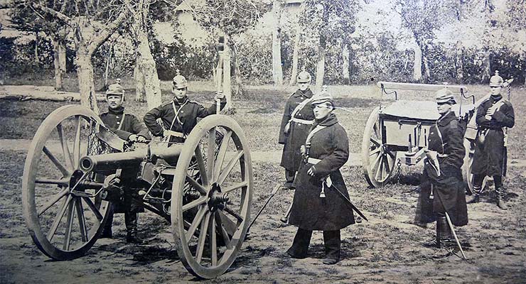 Das hier präsentierte Foto aus der in Köln erhalten gebliebenen Fotomappe zeigt ein Vierpfünder-Geschütz mit der vorschriftsmäßigen Anordnung von sechs Artilleristen, eine Aufnahme die während des Krieges in Frankreich wohl gestellt wurde - wegen des Tragens der Mäntel wahrscheinlich während der kälteren Jahreszeit Anfang 1871. In den Erinnerungen "Von Stade bis Gravelotte" des Artilleristen Friedrich Freudenthal, erschienen 1898, eine der seltenen Memoiren aus den Reihen der Artillerie, findet sich im Kapitel zur Schlacht von Gravelotte eine Beschreibung der Tätigkeiten, die von den sechs Artilleristen eines Geschützes ausgeübt werden sollten. Freudenthal diente zu dieser Zeit in der 3. schweren Fuß-Batterie des Schleswig-Holsteinischen Feld-Artillerie-Regiments Nr. 9 und schreibt zur Bedienung aus Ausstattung: