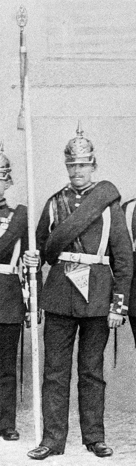 Der oben abgebildete Fahnenträger ist Sergeant Reimann vom Königs-Grenadier-Regiment Nr. 7, der mit den beiden anderen Fahnenträgern seines Regiments am 18. Januar 1871 zur Kaiserproklamation nach Versailles entsandt wurde. Dort nahm der Fotograf H. Schnaebeli die diversen Abordnungen auf und veröffentlichte sie in einem seltenen Prachtband - die Aufnahme stammt aus der Serie, die vom Historischen Bilderdienst vertrieben wird und dem ich für die Veröffentlichung hier danke.