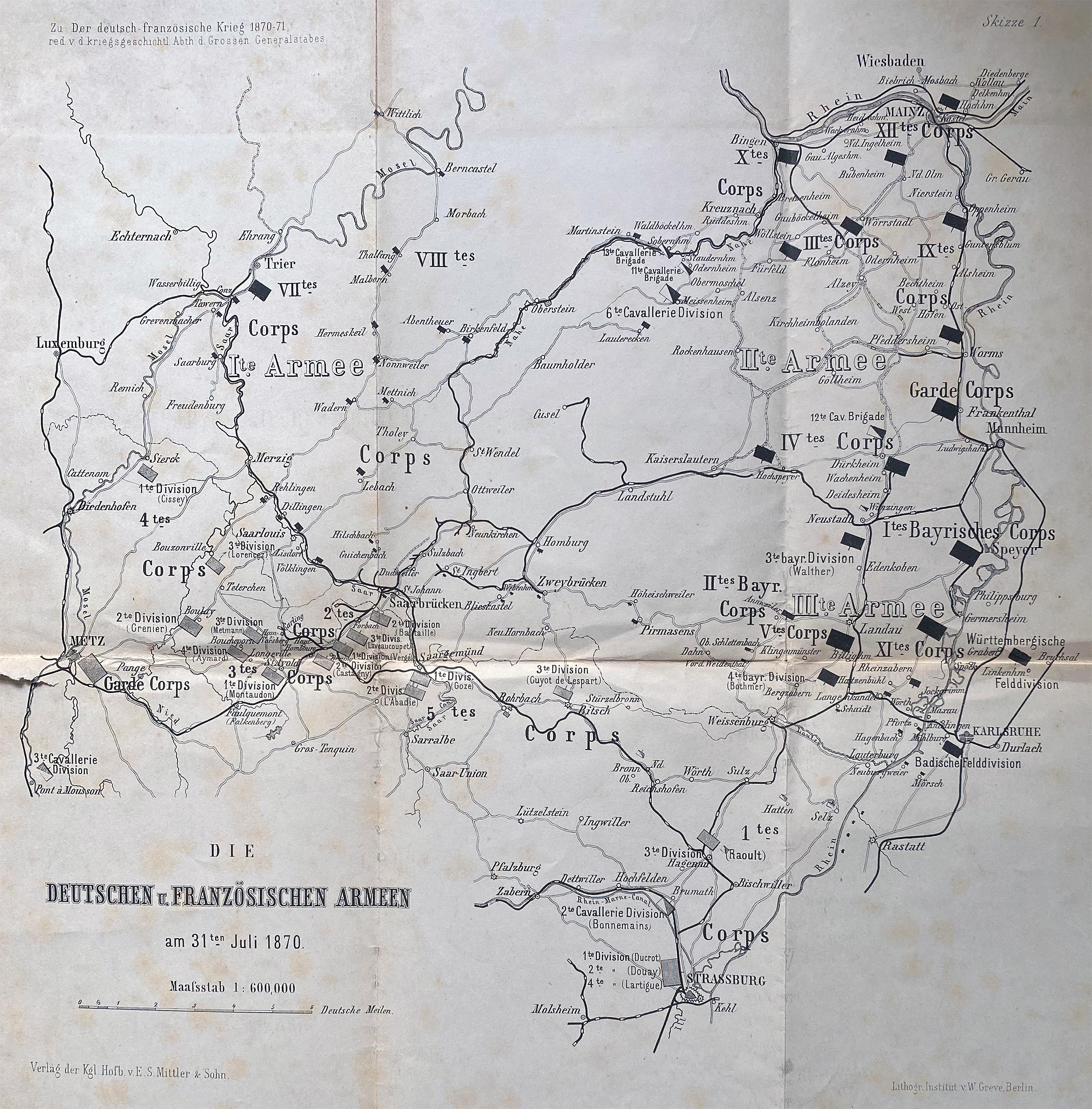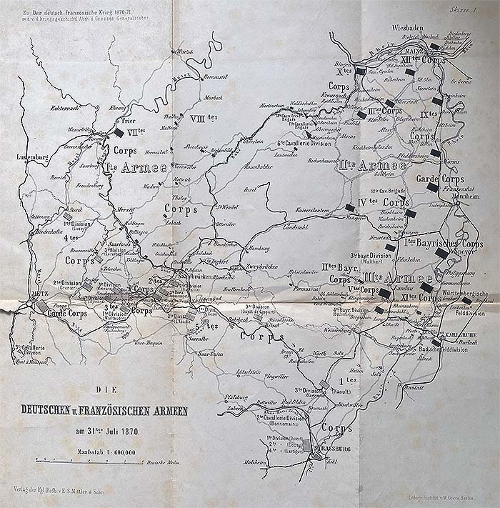| Stellung der Armeen am 31. Juli 1870 (aus dem Werk des Großen Generalstabes zum Krieg von 1870/71; in der Karte kann gezoomt werden) |