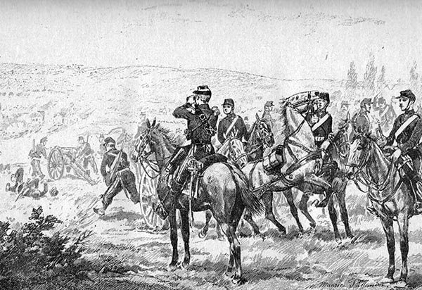 Als die Dunkelheit hereinbrach, machte sich der Rückzug des Feindes bemerkbar, indem er denselben durch eine formidable Kanonade zu decken suchte. Dieselbe verursachte uns wenig Schaden und namentlich unsere auf der linken Seite der Höhe stehende Batterie sah die Mehrzahl der feindlichen Granaten hoch oben in der Luft vor und hinter sich platzen.