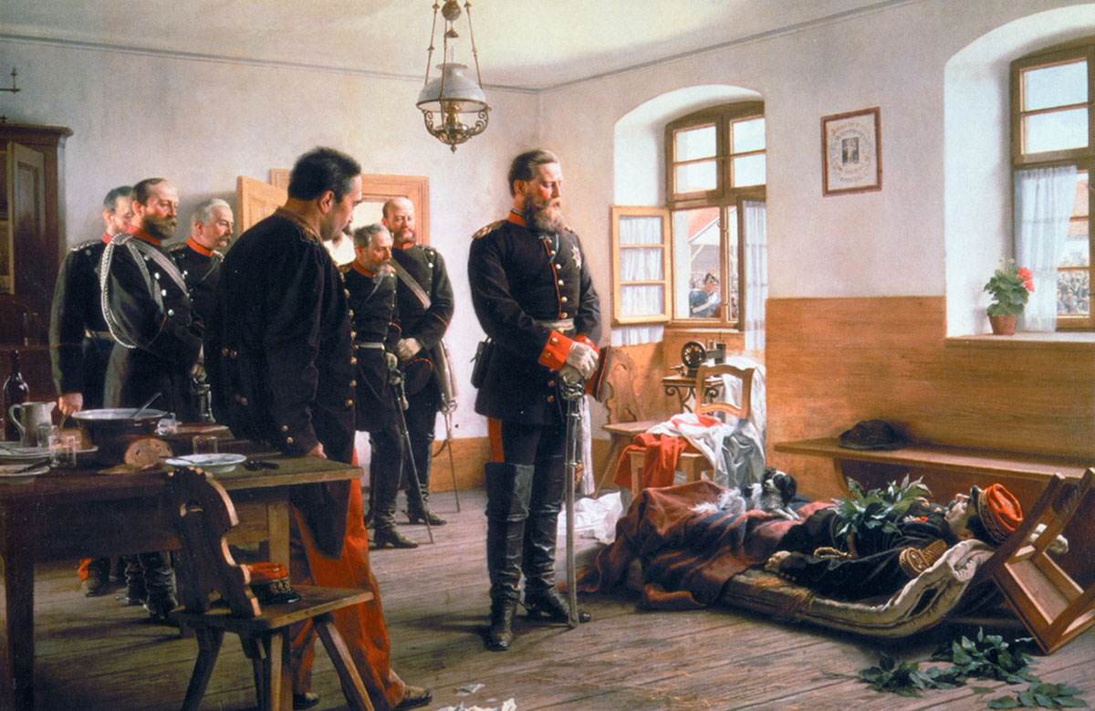 | Der preußische Kronprinz Friedrich Wilhelm beim gefallenen französischen General Douay nach der Schlacht von Weissenburg (A. von Werner) |