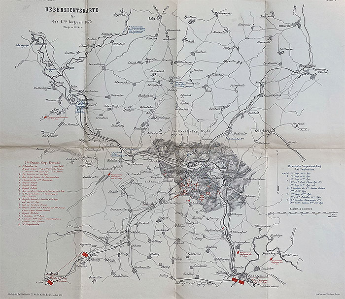 | Positionen um Saarbrücken am 2. August 1870 gegen 10 Uhr morgens (aus dem Werk des Großen Generalstabes zum Krieg von 1870/71; in der Karte kann gezoomt werden) |