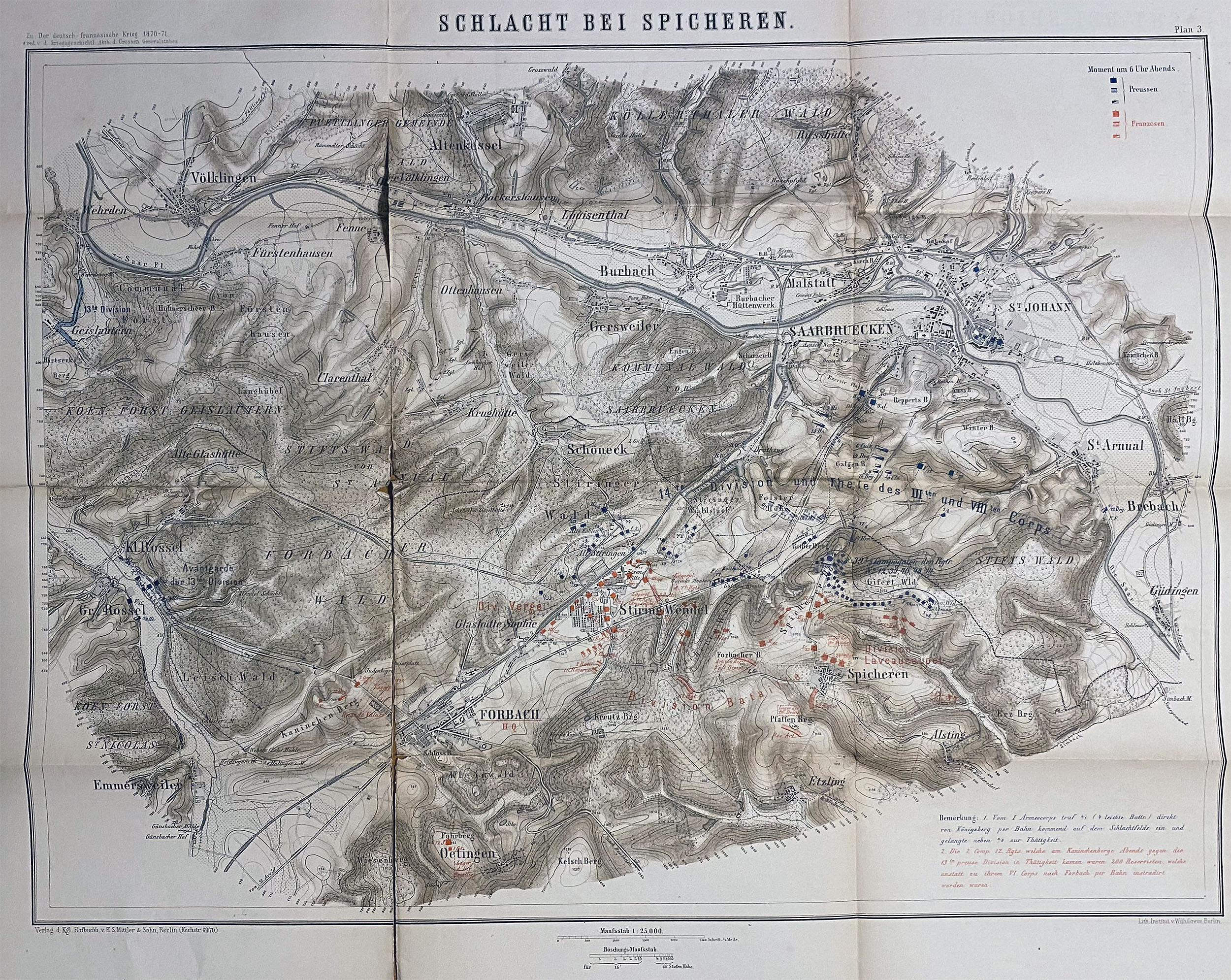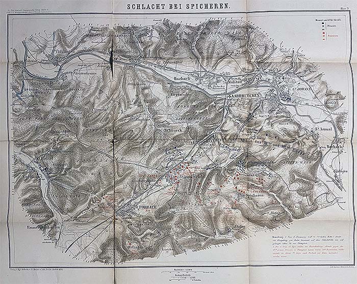 | Schlacht von Spichern am 6. August 1870 (aus dem Werk des Großen Generalstabes zum Krieg von 1870/71; in der Karte kann gezoomt werden) |
