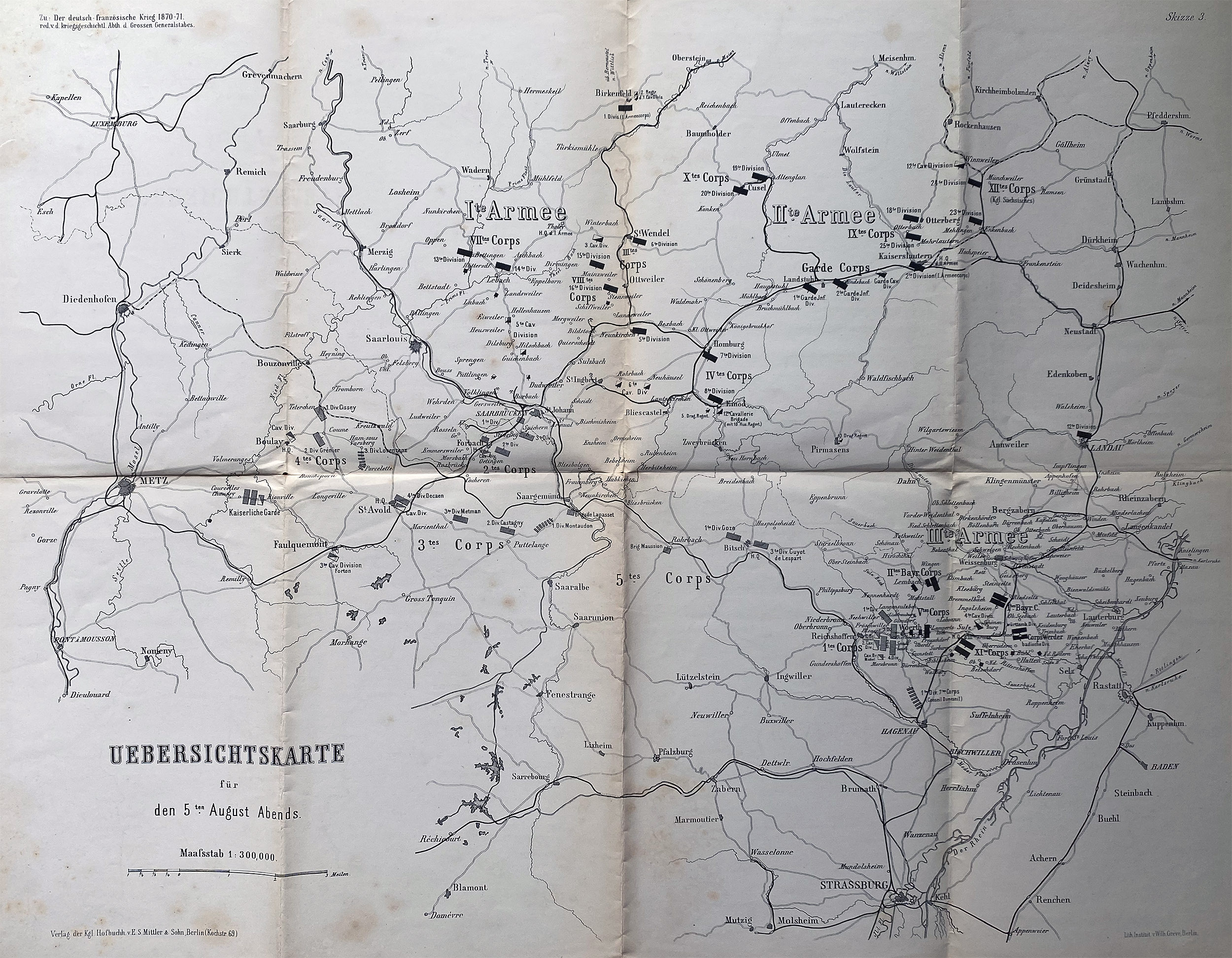 | Stellungen der Armeen am 5. August 1870 abends (aus dem Werk des Großen Generalstabes zum Krieg von 1870/71; in der Karte kann gezoomt werden) |