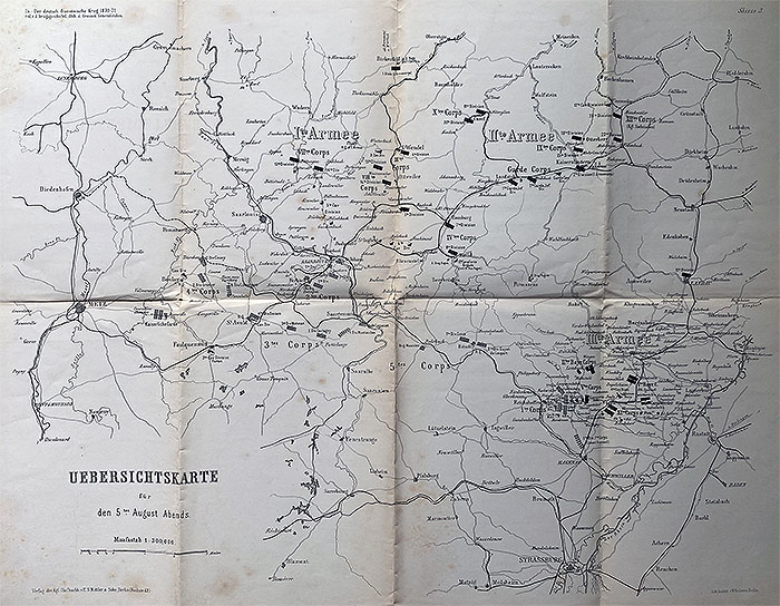 "Am 5. August befand sich das Hauptquartier des Kronprinzen zu Sulz, in dessen Umgegend die III. Armee versammelt war. Alle an diesem Tage eingelaufenen Nachrichten stimmten darin überein, dass sich das 1. Französische Corps unter Mac Mahon auf den Höhen westlich Wörth concentrirte und durch Truppen-Zuzüge auf der Eisenbahn verstärke. Se. Königliche Hoheit der Kronprinz beabsichtigte für den 6. August, das V. Armee-Corps mit der Front gegen die Sauer, östlich Wörth, stehen zu lassen, das XI. Armee-Corps von Sulz gegen Hölschloch und Sauerburg und die Division des General-Lieutenants v. Werder von Aschbach gegen Hohwiller und Reimerswiller vorzuschieben. Das zweite Bayerische Corps sollte auf dem rechten Flügel der neuen Aufstellung verbleiben, das erste Bayerische Corps als Reserve nach der Mitte derselben bei Preuschdorf herangezogen werden. Die Cavallerie-Division sollte in Schöneberg, das Hauptquartier in Sulz verbleiben.